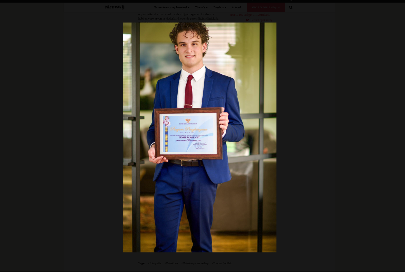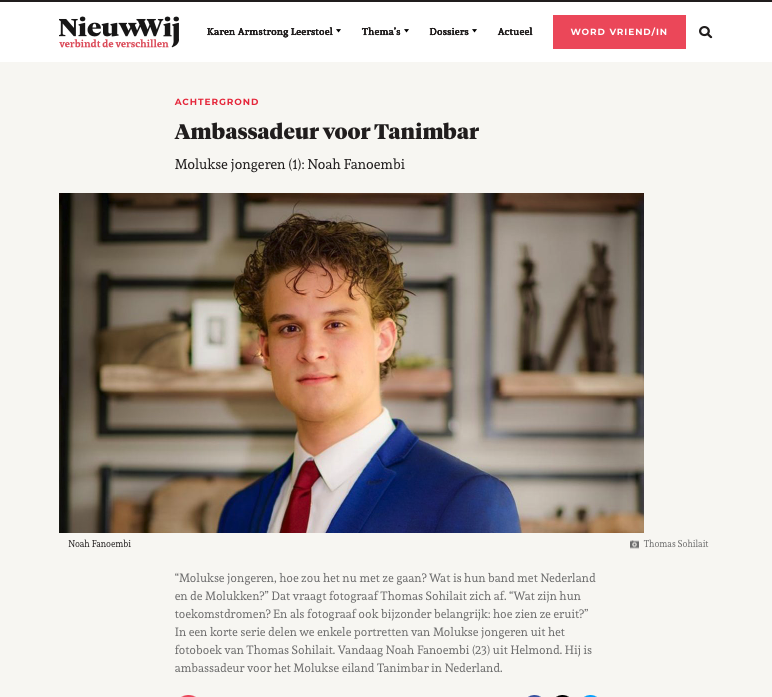 Op het nieuwsplatform NieuwWij verscheen onlangs een artikel over een van de Molukse jongeren uit het boek, Noah Fanoembi. NieuwWij schrijft het volgende: “Molukse jongeren, hoe zou het nu met ze gaan? Wat is hun band met Nederland en de Molukken?” Dat vraagt fotograaf Thomas Sohilait zich af. “Wat zijn hun toekomstdromen? En als fotograaf ook bijzonder belangrijk: hoe zien ze eruit?” In een korte serie delen we enkele portretten van Molukse jongeren uit het fotoboek van Thomas Sohilait. Vandaag Noah Fanoembi (23) uit Helmond. Hij is ambassadeur voor het Molukse eiland Tanimbar in Nederland.