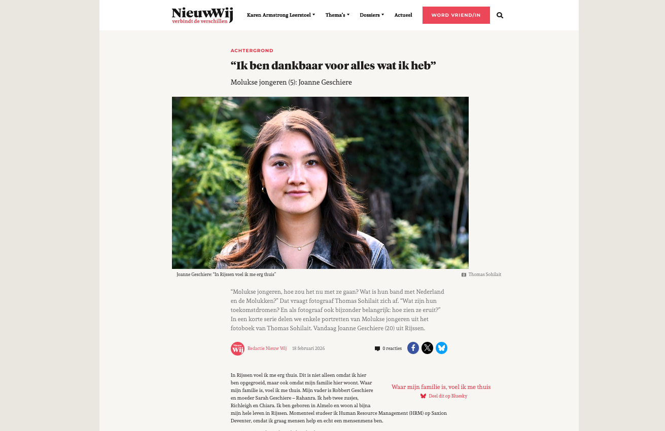 Op NieuwWij is opnieuw een portret gepubliceerd in de serie over Molukse jongeren in Nederland. Dit keer staat de 20-jarige Joanne Geschiere uit Rijssen centraal.